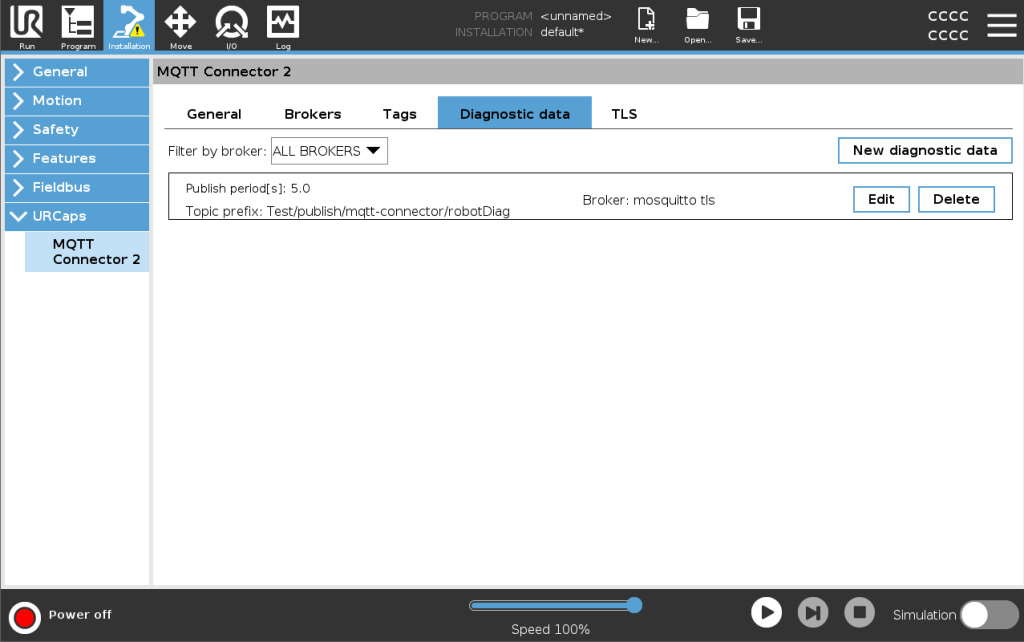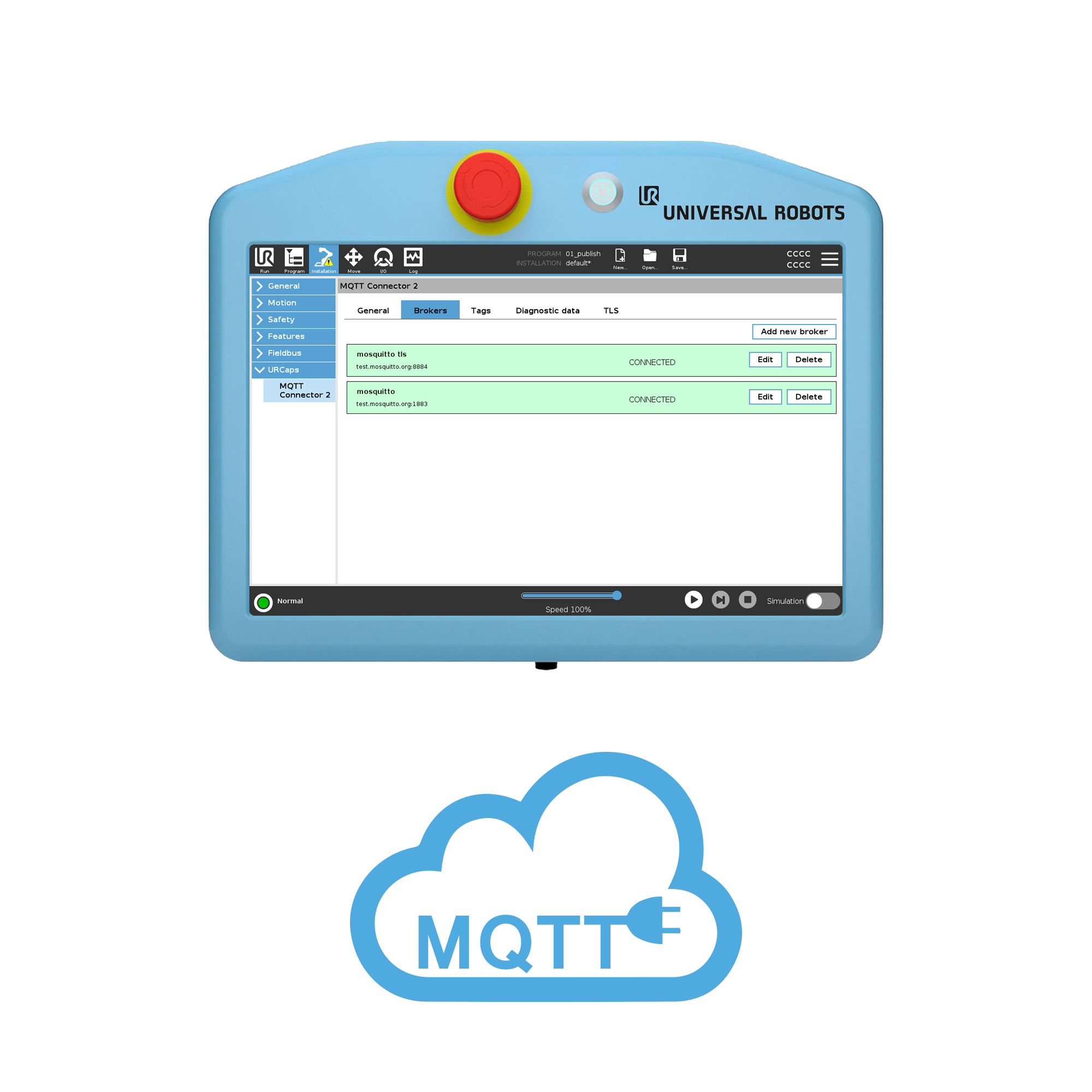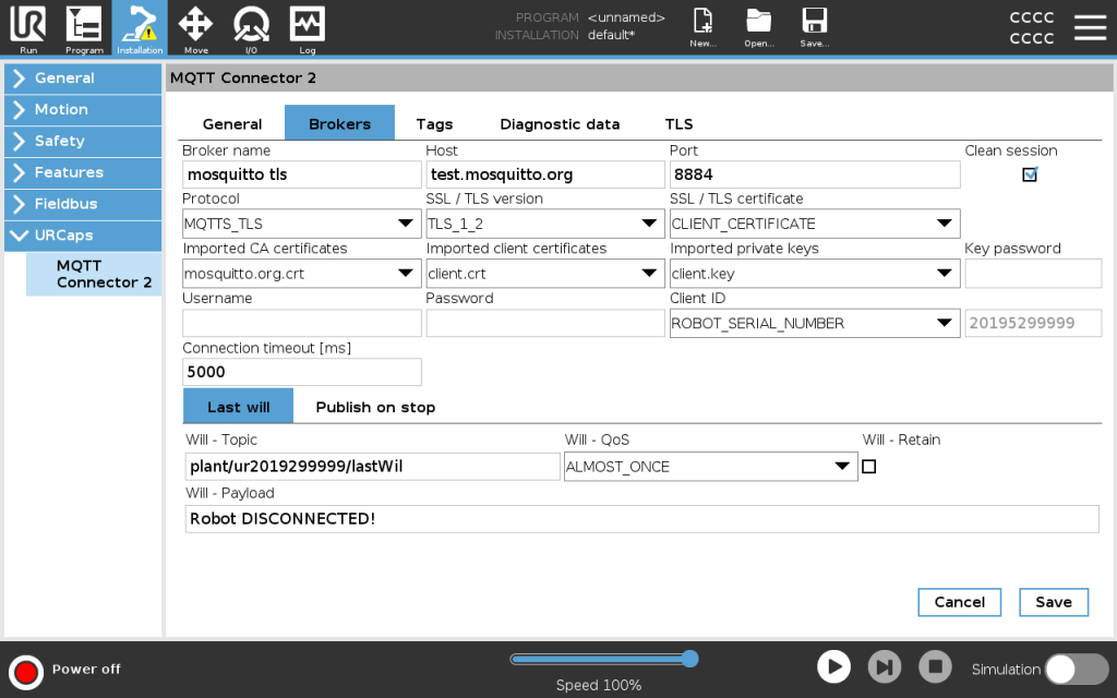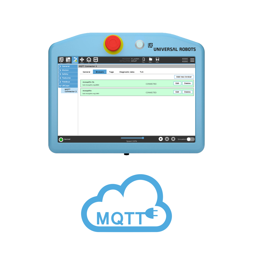 A NEW URCap plugin for Universal Robots to increase communication capability over the network with the MQTT v3.1 protocol. It now supports multiple brokers, an easy-to-use GUI, TLS client certificate connection, and publishing of robot diagnosis data.